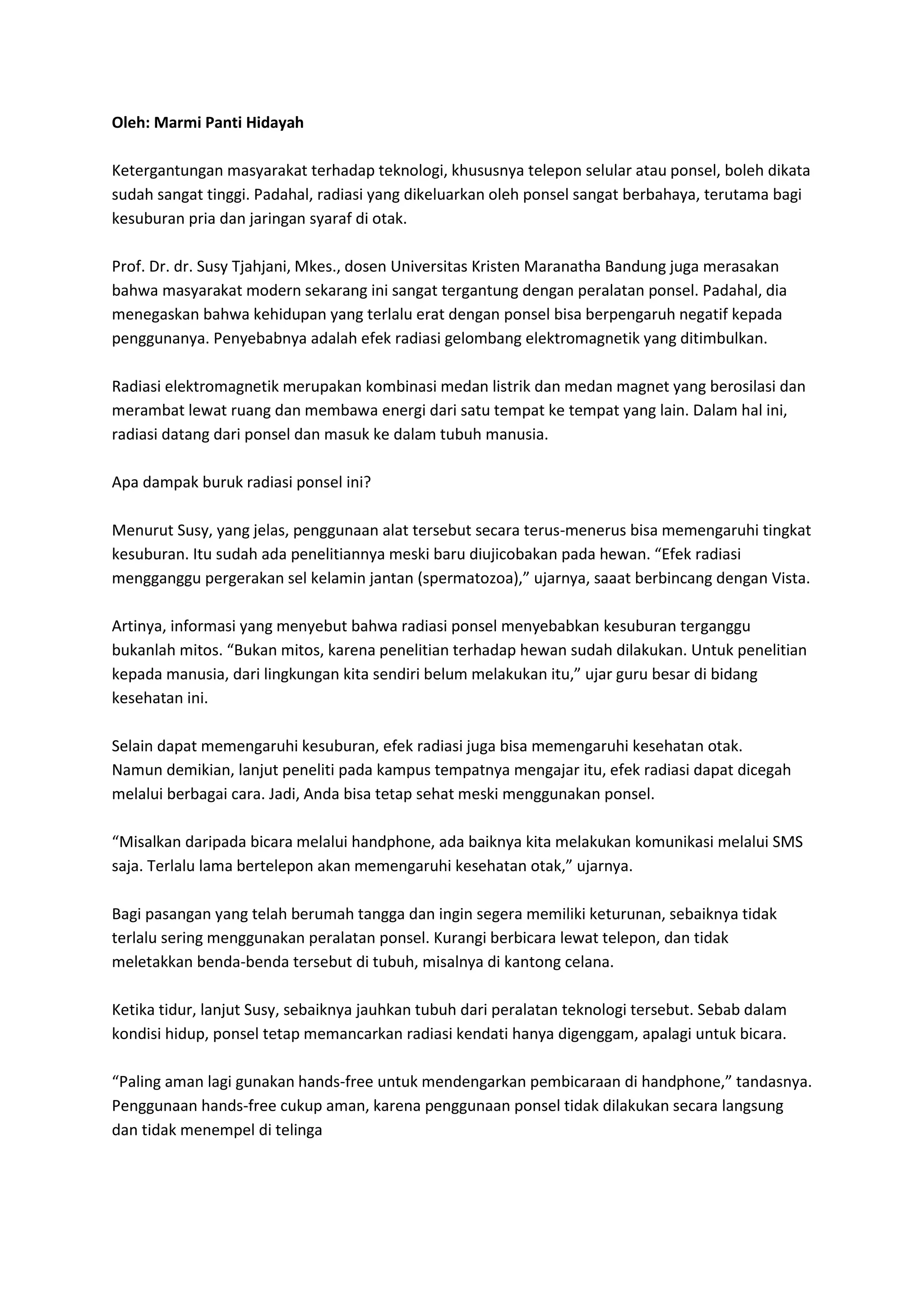 Dokumen ini membahas dampak negatif penggunaan ponsel, terutama terkait radiasi yang dapat mengganggu kesuburan pria dan kesehatan otak, serta mempengaruhi perkembangan anak dalam kandungan. Penelitian menunjukkan bahwa penggunaan ponsel secara berlebihan dapat meningkatkan risiko ADHD dan mengganggu konsentrasi. Selain itu, terdapat rekomendasi untuk mengurangi penggunaan ponsel dan memelihara kebersihan alat tersebut.