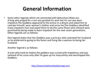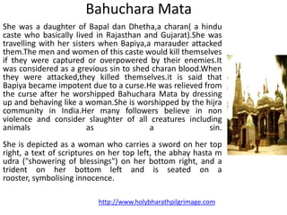 Bahuchara Mata, the daughter of Bapal Dan Dhetha from the Charan caste in Rajasthan and Gujarat, is a revered figure especially among the hijra community in India. She is associated with themes of non-violence and transformation, highlighting stories of men who became impotent as a consequence of their actions and later worshipped her to regain their masculinity. The temple dedicated to her is located in Becharaji, Gujarat, and is well-connected by rail and road.