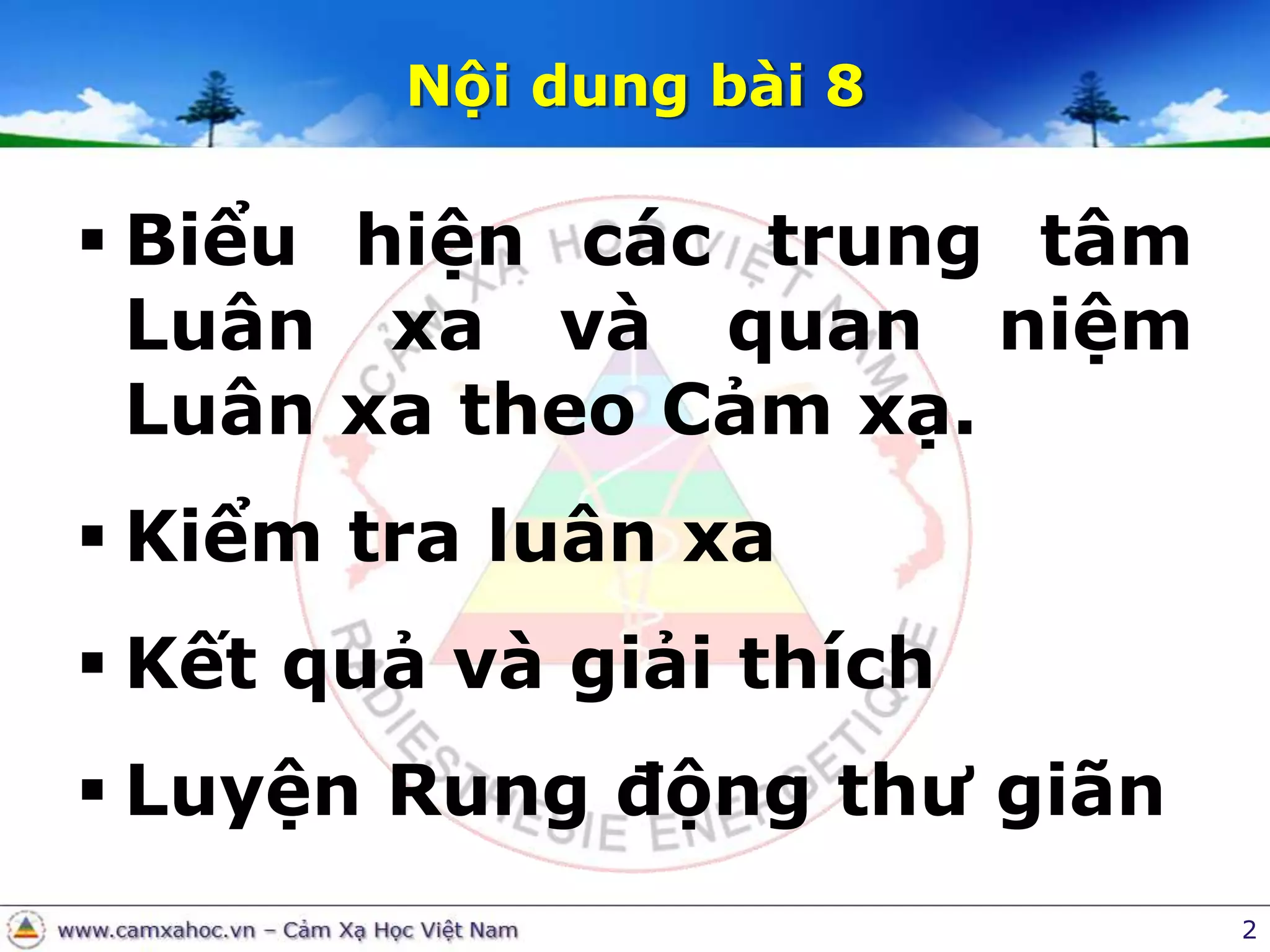 Bài 8 của giáo trình cảm xạ học trình độ A & B trình bày về các trung tâm luân xa và quan niệm về luân xa theo cảm xạ, cho thấy tầm quan trọng của luân xa trong việc thu nhận năng lượng từ vũ trụ. Tài liệu mô tả 7 luân xa chính và một số luân xa phụ, cùng với các đặc tính và chức năng của chúng trong cơ thể con người. Các luân xa được coi là cầu nối giữa vật chất và tinh thần, ảnh hưởng đến tình trạng sức khỏe và tâm linh.