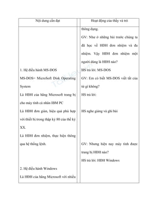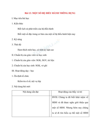 Bài học về các hệ điều hành thông dụng nhằm cung cấp kiến thức về lịch sử phát triển và đặc trưng của một số hệ điều hành như MS-DOS, Windows, Unix và Linux. Học sinh sẽ tìm hiểu về các đặc điểm của từng hệ điều hành, bao gồm việc sử dụng chế độ đơn nhiệm, đa nhiệm và mã nguồn mở. Cuối cùng, giáo viên củng cố kiến thức cho học sinh về các đặc trưng cơ bản của các hệ điều hành này.