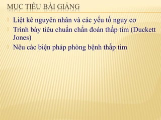 Tài liệu trình bày về bệnh thấp tim, nguyên nhân, yếu tố nguy cơ và tiêu chuẩn chẩn đoán theo Duckett Jones, đặc biệt nhấn mạnh nhóm tuổi 5-15 và các điều kiện sống không vệ sinh. Các triệu chứng lâm sàng bao gồm viêm khớp, viêm tim, và múa vờn với các biện pháp phòng ngừa là kháng sinh và vaccine. Bệnh có thể gây ra nhiều di chứng khác nhau tùy thuộc vào mức độ nghiêm trọng.