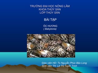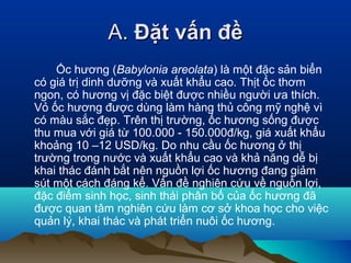 Ốc hương (Babylonia areolata) là một đặc sản biển có giá trị dinh dưỡng và xuất khẩu cao, với thịt thơm ngon và vỏ được sử dụng trong thủ công mỹ nghệ. Nguồn lợi ốc hương đang giảm do khai thác quá mức, vì vậy cần nghiên cứu về nguồn lợi và đặc điểm sinh học của nó để quản lý và phát triển nuôi trồng hợp lý.
