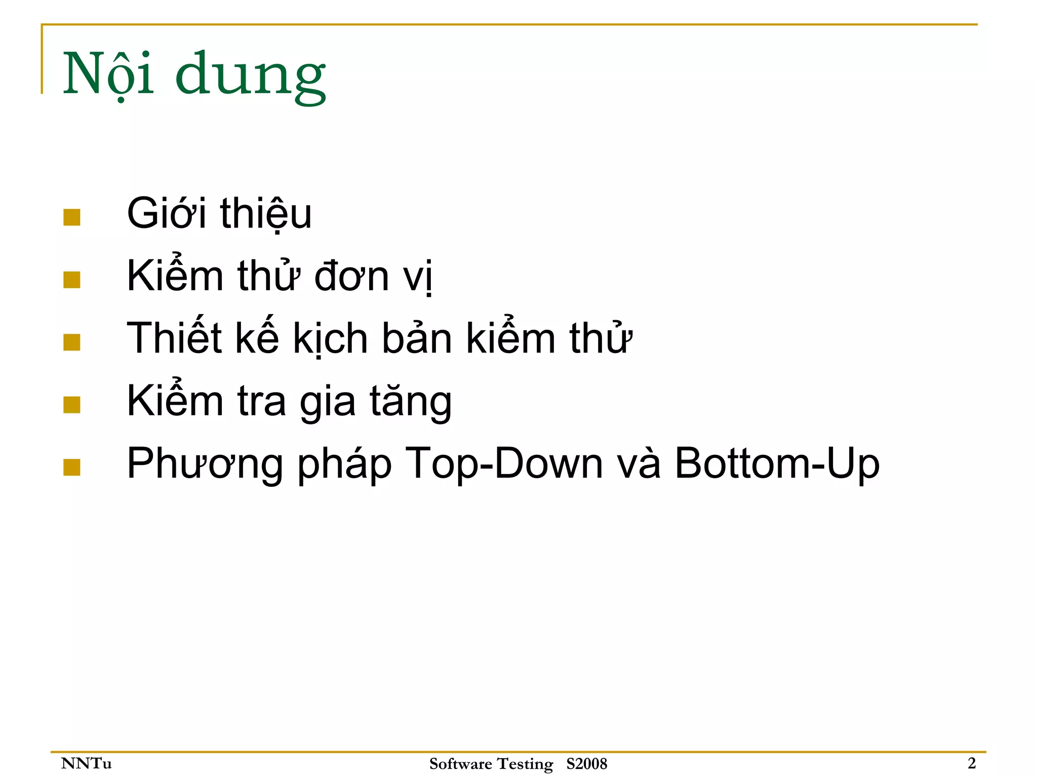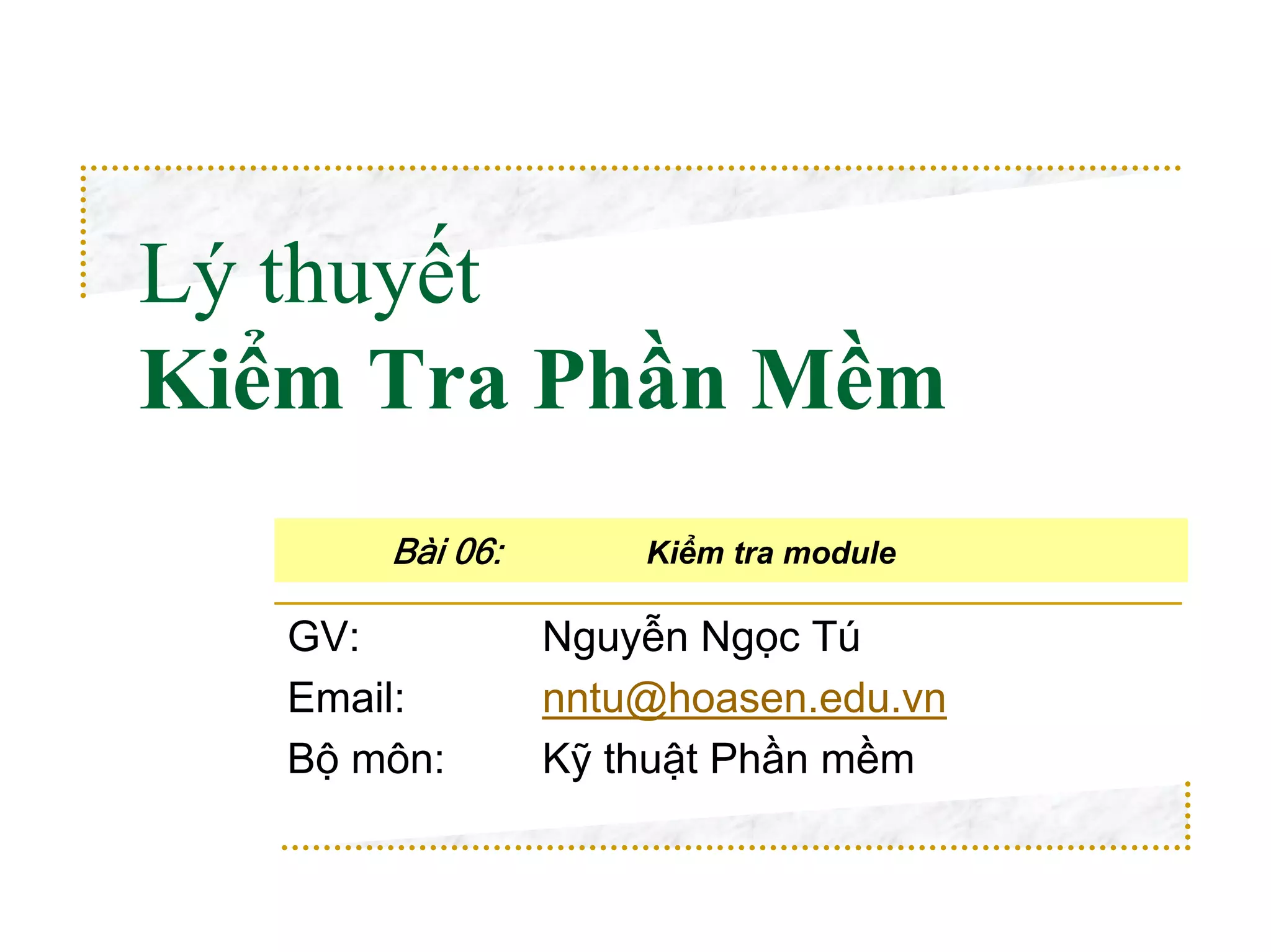 Tài liệu này trình bày lý thuyết về kiểm thử phần mềm, nhấn mạnh các phương pháp kiểm thử đơn vị như top-down và bottom-up. Nó mô tả quá trình thiết kế kịch bản kiểm thử và kiểm tra gia tăng, cũng như các yếu tố liên quan đến thiết kế mẫu thử và xác định lỗi. Cuối cùng, tài liệu đề cập đến các bài tập thực hành liên quan đến kiểm thử hàm chức năng.