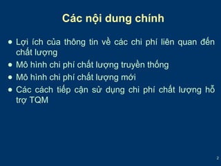 Tài liệu trình bày về quản lý chi phí chất lượng, nhấn mạnh lợi ích của việc xác định chi phí liên quan đến chất lượng trong doanh nghiệp. Nó mô tả các mô hình chi phí chất lượng truyền thống và cách thức thiết lập hệ thống xác định chi phí này để hỗ trợ quản lý chất lượng toàn diện (TQM). Các vấn đề hạn chế trong mô hình cũng được đề cập, bao gồm việc bỏ sót các chi phí gián tiếp và chi phí vô hình.