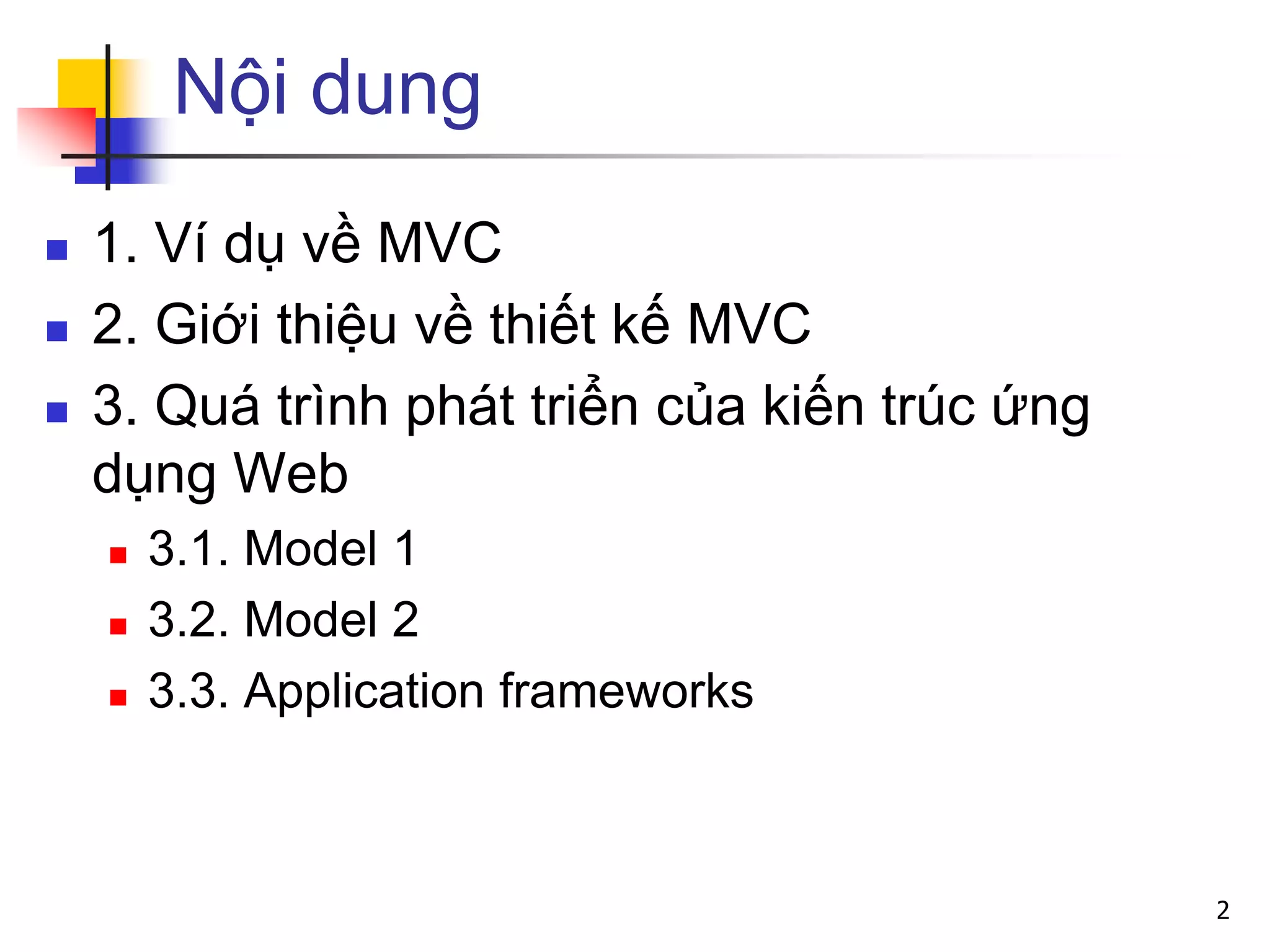 Tài liệu giới thiệu về mô hình thiết kế MVC và sự phát triển của kiến trúc ứng dụng web qua các mô hình Model 1 và Model 2. Nó cung cấp ví dụ về ứng dụng Java sử dụng JSP và servlet để tách biệt các tầng business logic và presentation. Cuối cùng, tài liệu đề cập đến các framework ứng dụng web hiện đại dựa trên mô hình MVC để cải thiện khả năng phát triển và bảo trì.