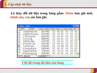 Tài liệu hướng dẫn quy trình cập nhật dữ liệu trong bảng, bao gồm việc thêm, chỉnh sửa và xoá bản ghi. Nó cũng mô tả cách sắp xếp, tìm kiếm và lọc bản ghi theo các điều kiện nhất định, cùng với hướng dẫn in dữ liệu từ bảng. Các thao tác cụ thể được trình bày theo từng bước rõ ràng.