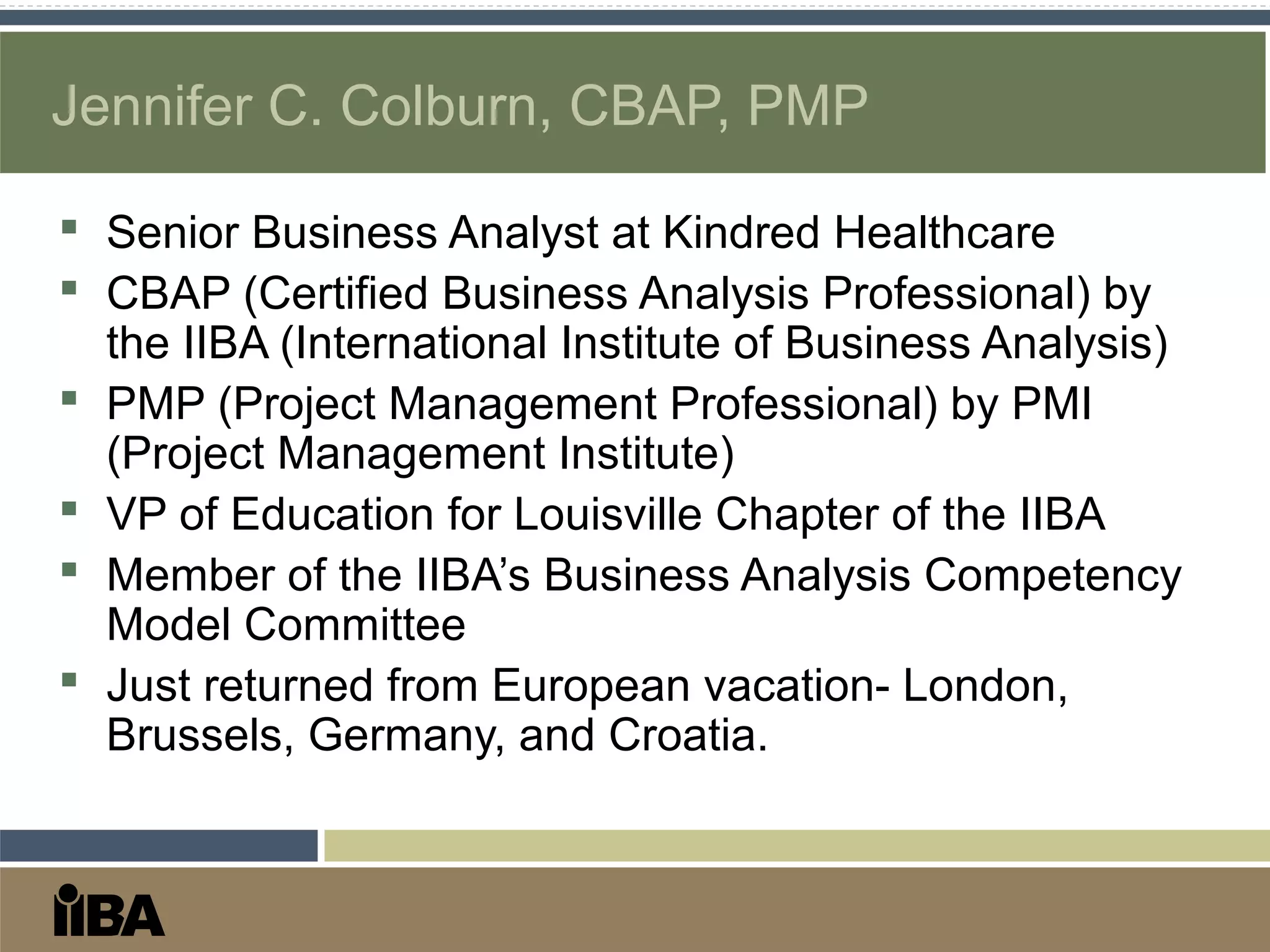 The document outlines the role and importance of business analysts in organizations, detailing their responsibilities in defining solutions that align with business goals. It discusses the principles and standards of the business analysis profession, as well as levels of certification such as CBAP and CCBA from the IIBA. Techniques for eliciting requirements and ensuring successful communication among stakeholders are also emphasized, illustrating how business analysts contribute to project success.