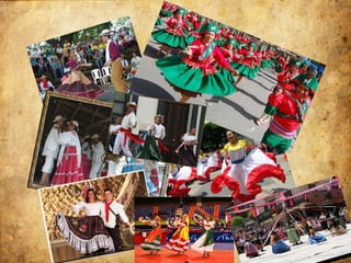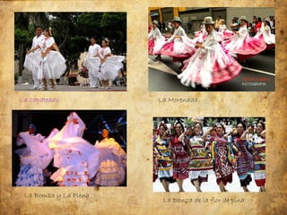 This document lists and describes several traditional dances from Mexico, including La zapateado, La Morenada, La Bomba y La Plena, La Danza de la flor de pina, and Las Alazanas. It also mentions Tinikling and provides bibliographic references for additional information on traditional clothing and dances from the state of Jalisco, Mexico, including links to videos demonstrating some of the dances.
