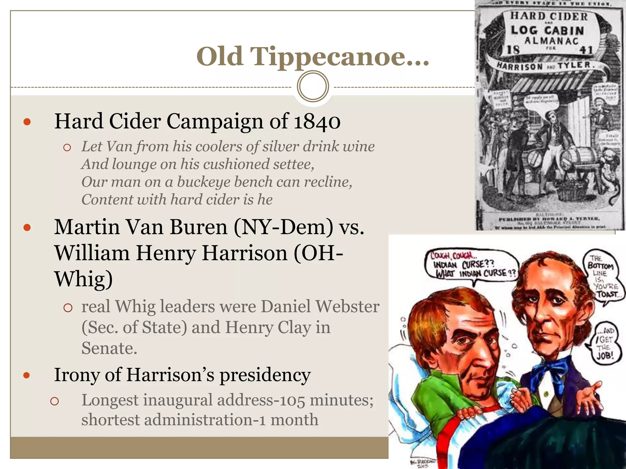 2) It outlines the election of James K. Polk in 1844 and his agenda to annex Texas and acquire Oregon and California from Britain and Mexico.