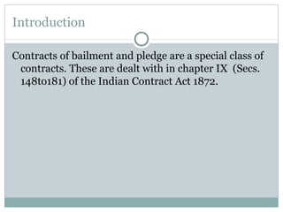 This document discusses contracts of bailment and pledge under Indian law. It defines bailment as the delivery of goods by one person to another for some purpose according to a contract. The person delivering the goods is called the bailor and the person receiving them is called the bailee. Pledge is a type of bailment where goods are delivered as security for a debt or promise. The document outlines the requisites of a valid bailment, as well as the duties of bailors and bailees. These include the bailor's duty to disclose known faults and the bailee's duty to take reasonable care of goods and not mix them with their own goods.