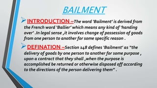 This document discusses the legal concepts of bailment and pledge. It defines bailment as the delivery of goods by one person to another for a specific purpose, to be returned after. The person delivering the goods is the bailor and the person receiving is the bailee. Bailment can be gratuitous (without compensation) or non-gratuitous. Pledge is a type of bailment where goods are delivered as security for a debt. The person delivering the goods is the pawnor and receiving is the pawnee. The document outlines the duties and rights of bailors/pawnees and bailees/pawnees, and provides examples to distinguish between bailment and pledge