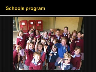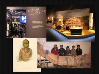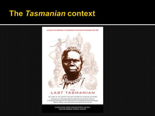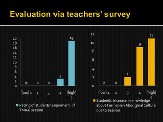 The document discusses strategies for teaching culture and history at the Tasmanian Museum & Art Gallery. It reports that teacher sessions at the museum have led to a 100% increase in teacher knowledge. It emphasizes ensuring cultural authenticity through partnerships that provide historical expertise. The museum aims to create engaging experiences for visitors through hands-on activities with real artifacts and thematic interpretation using TORETM methods.