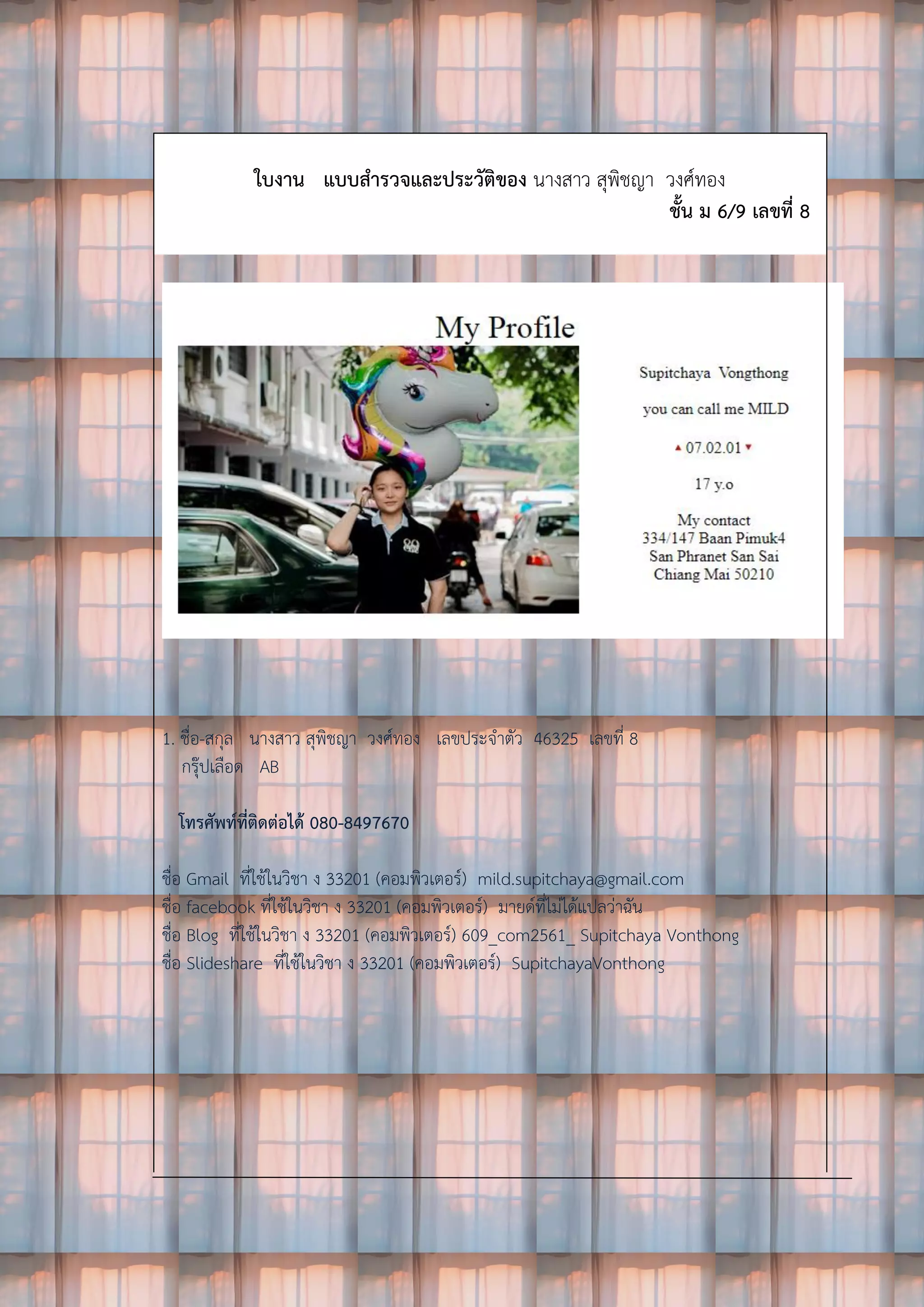 สุพิชญา วงศ์ทอง ชั้น ม 6/9 เลขที่ 8 1. ชื่อ-สกุล นางสาว สุพิชญา วงศ์ทอง เลขประจาตัว 46325 เลขที่ 8 กรุ๊ปเลือด AB โทรศัพท์ที่ติดต่อได้ 080-8497670 ชื่อ Gmail ที่ใช้ในวิชา ง 33201 (คอมพิวเตอร์) mild.supitchaya@gmail.com ชื่อ facebook ที่ใช้ในวิชา ง 33201 (คอมพิวเตอร์) มายด์ที่ไม่ได้แปลว่าฉัน ชื่อ Blog ที่ใช้ในวิชา ง 33201 (คอมพิวเตอร์) 609_com2561_ Supitchaya Vonthong ชื่อ Slideshare ที่ใช้ในวิชา ง 33201 (คอมพิวเตอร์) SupitchayaVonthong