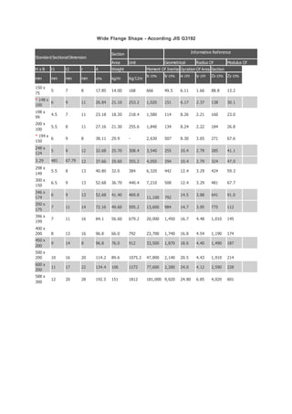 This document provides specifications for various standard H-beam, wide flange, lip channel, and equal angle steel sections. It includes dimensions such as height, width, thickness, area, weight, moments of inertia, radii of gyration, and other geometric properties. Sections range in size from 100x100 mm to 588x300 mm for H-beams, 148x100 mm to 500x200 mm for wide flanges, 100x50x20 mm to 200x75x20 mm for lip channels, and 40x40 mm to 120x120 mm for equal angles. Properties are specified in metric units.