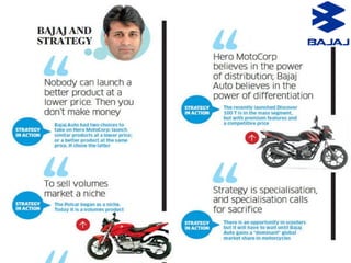 Founded in 1926, Bajaj Auto Ltd is India's second largest motorcycle manufacturer. It has 34 companies in its group and owns 51% of KTM. While its most famous tagline is "Hamara Bajaj", it aims to attain world class excellence through value-added products. Bajaj faces competition from Hero MotoCorp and Honda but differentiates itself through extensive R&D and a focus on performance motorcycles. Going forward, it aims to leverage its alliance with KTM and expand into new markets to potentially become the number one player in India.