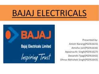 1) Bajaj Electricals is a 79 year old Indian company with a turnover of Rs. 3099 Crores that produces fans, lighting, appliances, and engineering projects.