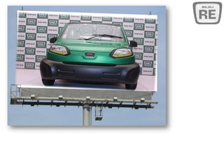 Modern India's answer to safe, convenient and economical commercial transport on the road. The document analyzes the company environment, customers through market segmentation and targeting auto rickshaw owners and new buyers. It details the product positioning as a replacement for three wheelers with fuel efficiency, lower emissions, attractive design, upgraded features and safety. It discusses price at 1.8 L with value based pricing and quicker payback model. Place includes a 1 state launch and 1S model. Promotion strategies include IMC, exchange policy, auto stands, auto stickers, financing, in film marketing, rural fairs and trade fairs, radio and billboard.