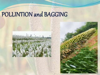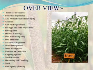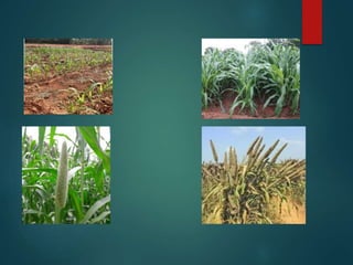 This document provides an overview of cultivation practices for pearl millet. It discusses the botanical description, economic importance, varieties, climatic requirements, soil type, sowing methods, nutrient management, irrigation, weed control, and harvesting. Key details include that pearl millet is grown in India, Africa, and other areas for food, fodder, and beer. It prefers well-drained soils and temperatures between 20-34°C, and is drought tolerant. Common varieties and sowing practices vary by region. Nutrient needs include nitrogen, phosphorus, and sometimes zinc or iron supplements. Weeding is important before tillering and flowering stages.