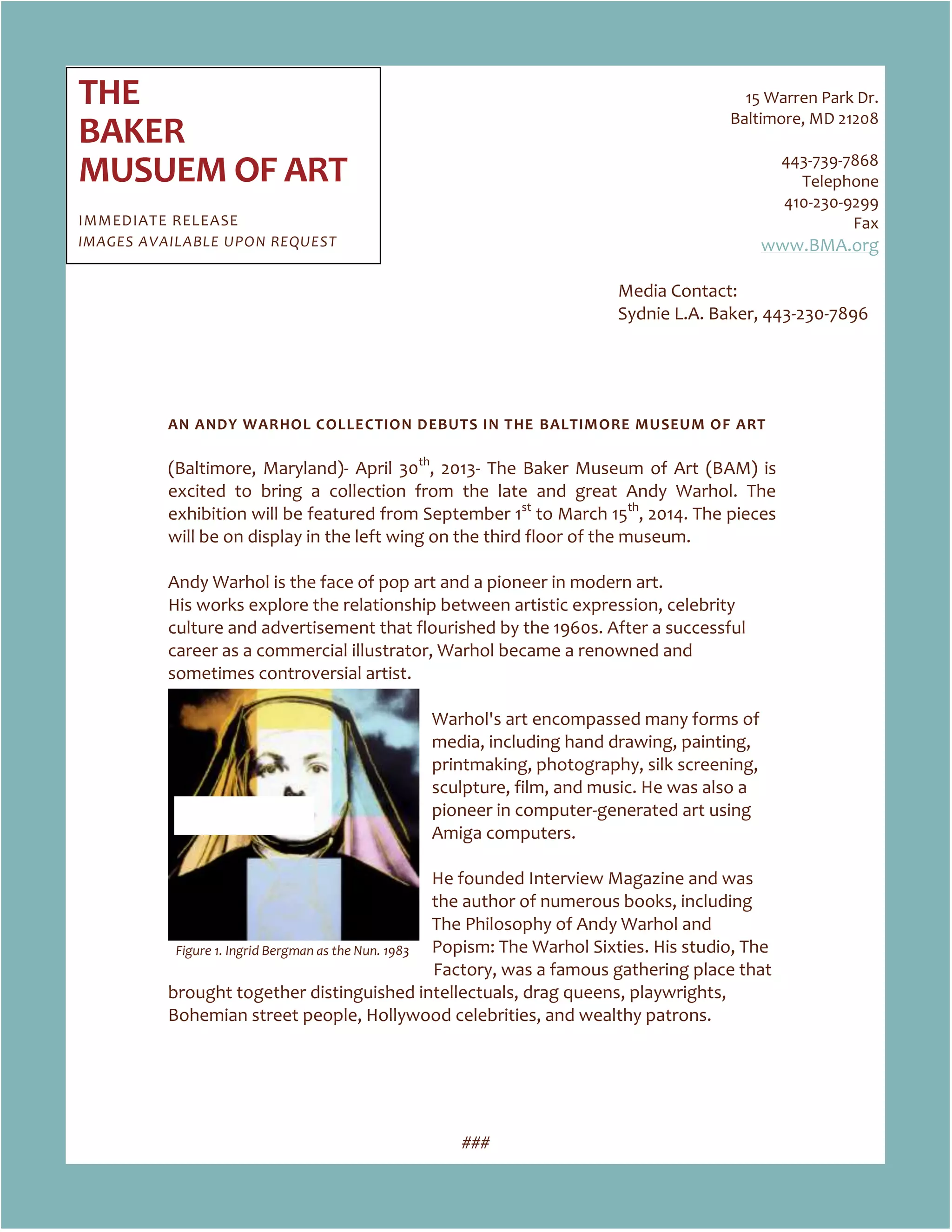 The Baker Museum of Art will debut an Andy Warhol collection from September 1st to March 15th, 2014. Andy Warhol, a pioneer of pop art, created works across many mediums including painting, printmaking, photography and film. His pieces in the exhibition will be displayed in the left wing of the museum's third floor.