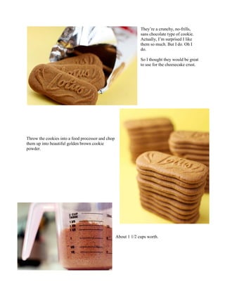 This document provides a recipe for chocolate biscoff cheesecake bars. The crust is made from crushed biscoff cookies, brown sugar, and melted butter. The cheesecake layer consists of cream cheese, sugar, flour, eggs, and sour cream. Once baked, a chocolate ganache is poured over the cheesecake and refrigerated overnight before cutting into bars. Optional cookies can be sprinkled on top of the ganache for extra crunch.