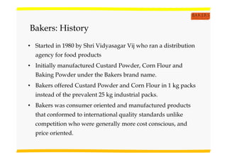 Bakers Spices & Ingredients, founded in 1980 by Shri Vidyasagar Vij, initially focused on consumer-friendly food products like custard powder and corn flour. The company operates from Coimbatore, has expanded its distribution across southern India and internationally, and is known for its high-quality standards and diverse product portfolio. Bakers competes primarily with brands like Weikfield, Everest, and MDH, achieving national recognition as the second-largest custard powder brand and the top seller in South India.