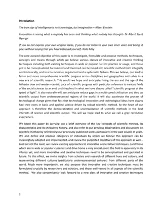 This document discusses baking innovative and creative thinking techniques into scientific method to increase scientific output. It begins with an overview of scientific method, then discusses objectives of integrating innovative techniques, such as eschewing dogma and challenging established notions. Lastly, it states the integration aims to lead to greater scientific progress through discoveries, explanations, new paradigms, and communicating results.