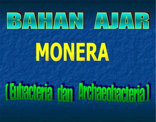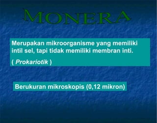 Monera merupakan mikroorganisme prokariotik uniseluler yang tidak memiliki membran inti dan berukuran mikroskopis. Terdiri atas eubacteria dan archaeobacteria yang memiliki ciri-ciri reproduksi pembelahan amitosis serta mampu hidup di berbagai habitat ekstrem. Bakteri bermanfaat sebagai pengurai, produsen antibiotik dan pangan, serta pengikat nitrogen, namun juga dapat berpatogen menyebabkan berbagai penyakit.