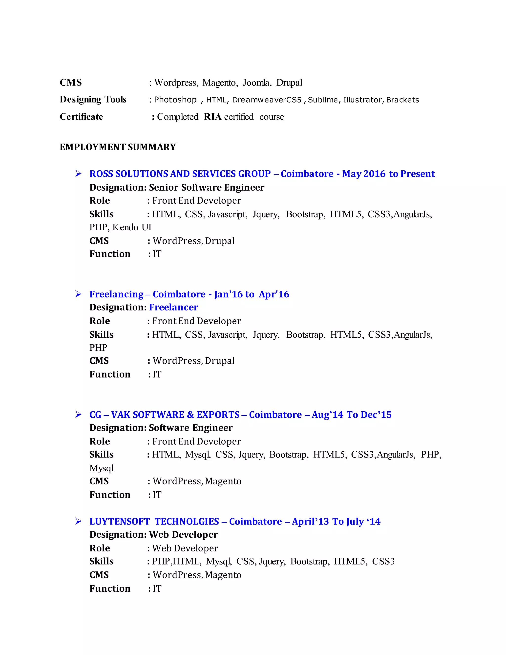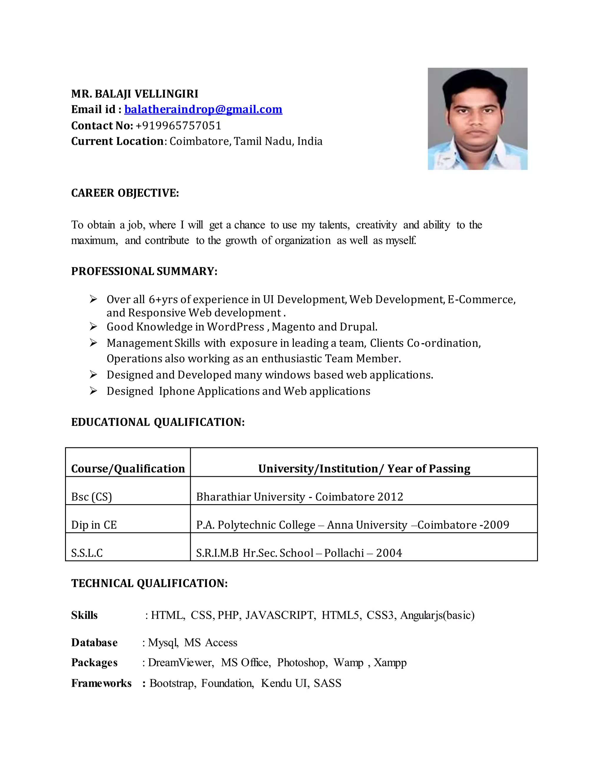 - Balaji Vellingiri is a senior software engineer from Coimbatore, India seeking a job involving front-end development using skills like HTML, CSS, JavaScript, PHP, and frameworks like Bootstrap and AngularJS.