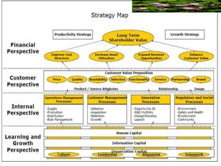 The document discusses the balanced scorecard approach and organizational capabilities. It presents the four perspectives of the balanced scorecard: learning and growth, internal business process, customer, and financial. It then lists and defines 12 key organizational capabilities such as talent, innovation, customer connectivity, and efficiency. For each capability, it provides an explanation and suggestions for ways to evaluate and track that capability within an organization.