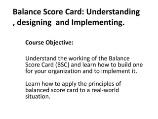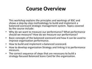 This document provides an overview of a 3-day course on understanding, designing, and implementing a Balance Score Card. The course objectives are to understand how a Balance Score Card works and how to build one for an organization. The course covers the basic concepts of a Balance Score Card, how to develop an organization's strategy and link it to performance measures, and the six-step methodology to build and implement a Balance Score Card system. The course outline details the modules that will be covered over the 3 days, including introducing performance measurement, an overview of the Balance Score Card, building the Balance Score Card, and implementing it in an organization.