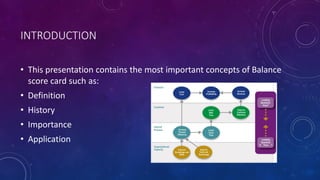 The document discusses the Balance Scorecard, a strategic management tool developed by Robert Kaplan and David Norton in the 1990s. It defines the Balance Scorecard as a system used to align business activities with an organization's vision and strategy. The Balance Scorecard follows four perspectives: the customer, financial, internal processes, and learning and growth. It helps organizations track goals, improve performance and communications, and link strategic objectives to actions. The document outlines the key facts, components, benefits, and references related to the Balance Scorecard concept.