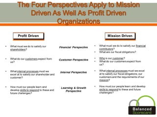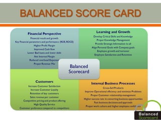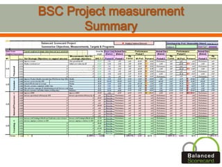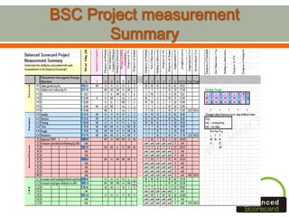 The document discusses using a balanced scorecard methodology to analyze sales transactions and key performance indicators (KPIs) at Vodafone. A BMIS application was developed using the balanced scorecard framework to link objectives with measures across financial and non-financial perspectives like customers, internal processes, learning and growth. Sales data was transformed into a detailed roadmap to measure performance against KPIs. The balanced scorecard provided a comprehensive view of business operations and facilitated strategy communication across the organization.