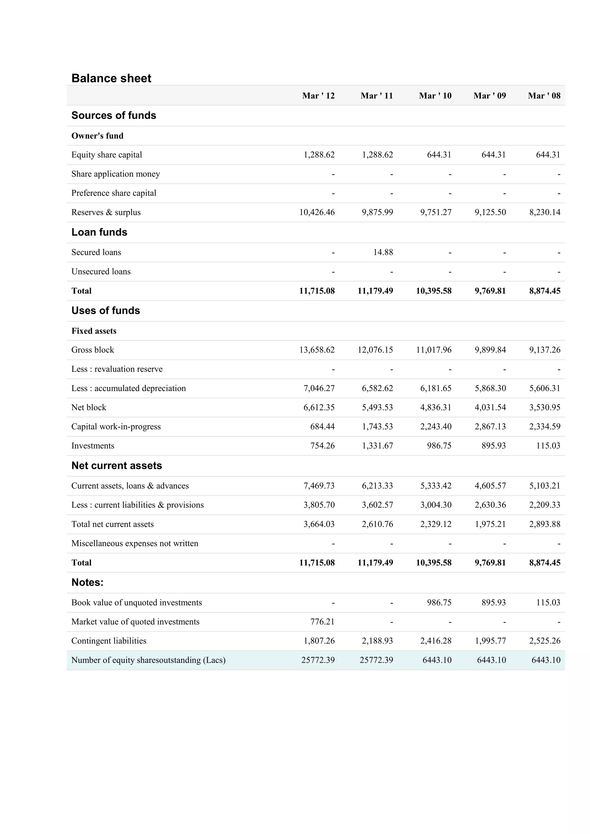 The balance sheet shows the company's financial position over several years. Sources of funds include equity share capital, reserves and surplus, and secured loans. Uses of funds include net block, capital work-in-progress, investments, and net current assets. Key items include equity share capital increasing from Rs. 644.31 lacs to Rs. 1,288.62 lacs from 2010 to 2012, reserves and surplus growing to Rs. 10,426.46 lacs by 2012, and net current assets expanding to Rs. 3,664.03 lacs in 2012.