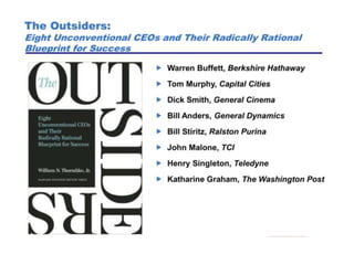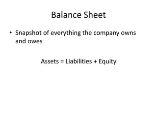 The document discusses balance sheets and their components. It begins by explaining that a balance sheet provides a snapshot of everything a company owns (assets) and owes (liabilities and equity), where assets must equal liabilities plus equity. It then discusses the key components of a balance sheet - current and non-current assets, like cash, inventory, and property/equipment; current and non-current liabilities, like accounts payable and debt; and equity, including retained earnings. It also covers how companies allocate capital between investing in their business, acquisitions, debt repayment, and returning value to shareholders. Effective capital allocation is positioned as the CEO's most important job.