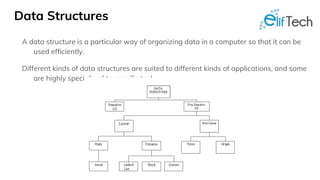 The document discusses various advanced data structures including binary search trees, AVL trees, red-black trees, and B-trees, focusing on their properties, operations, and use cases. It highlights the importance of understanding these structures for optimizing application performance and provides comparisons between different types. Practical applications in databases and the impact of tree balance on efficiency are emphasized.