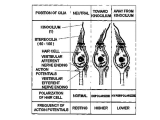 The vestibular system includes the semicircular canals and otolith organs which help maintain balance and spatial orientation. The semicircular canals detect rotational head movements and provide information about angular velocity to the brain. The otolith organs detect linear acceleration and provide information about the direction of gravity. Together the vestibular system helps control posture and eye movements like the vestibulo-ocular reflex which allows clear vision during head movements. Damage to the vestibular system can cause nystagmus and vertigo.