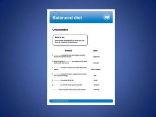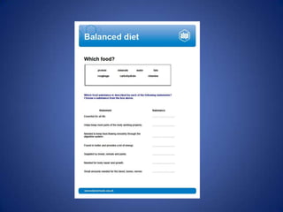 The document discusses the food guide pyramid and how it can help create a balanced diet. It explains that the food guide pyramid recommends getting carbohydrates like rice and bread from the base, fruits and vegetables from the middle layers for vitamins and fiber, and proteins like milk, fish, and meat from the upper layers. It also notes the importance of moderate physical activity, sleep, and minerals for a balanced diet according to the food guide pyramid.