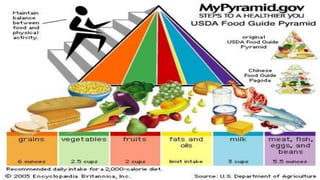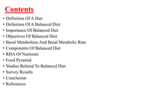 The document outlines the importance, components, and implications of a balanced diet, emphasizing its role in maintaining health and preventing diseases. It discusses dietary requirements based on different nutrients and introduces the food pyramid as a guideline for nutritious eating. Additionally, the document connects diet to oral health, particularly in relation to dental erosion caused by acidic foods and beverages.