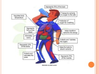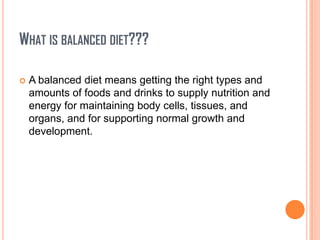 A balanced diet provides the right types and amounts of foods and drinks to maintain health. It includes major nutrients like proteins, carbohydrates, fats, vitamins, and minerals. Proteins help build muscle and boost immunity. Carbohydrates provide energy while fats transport vitamins and insulate organs. Vitamins and minerals support various bodily functions. A balanced diet along with physical activity and supplements can help ensure adequate nutrient intake and prevent deficiencies that impact health. Maintaining a positive attitude also contributes to overall well-being.