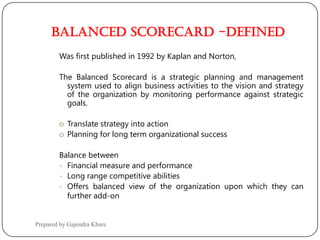 The document summarizes the Balanced Scorecard framework. It discusses that the Balanced Scorecard was created in 1992 by Kaplan and Norton to align business activities with organizational strategy. It balances financial and non-financial metrics as well as short-term and long-term measures across four perspectives: financial, customer, internal processes, and learning and growth. The Balanced Scorecard is used to translate strategy into action through strategic maps and scorecards that measure performance against strategic goals. Key success factors for implementation include executive sponsorship, involvement of leaders and employees in development, and viewing it as a long-term process rather than short-term project.
