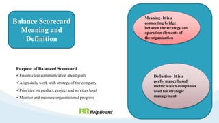 The balanced scorecard is a strategic management tool that connects organizational strategy with performance metrics, utilizing both financial and non-financial data. Developed by Kaplan and Norton in the early 1990s, it includes four key perspectives: financial, customer, internal processes, and learning and growth, aimed at improving communication and monitoring business performance. While it enhances clarity and aligns work with organizational goals, it can be complex for employees and requires regular updates to remain relevant.