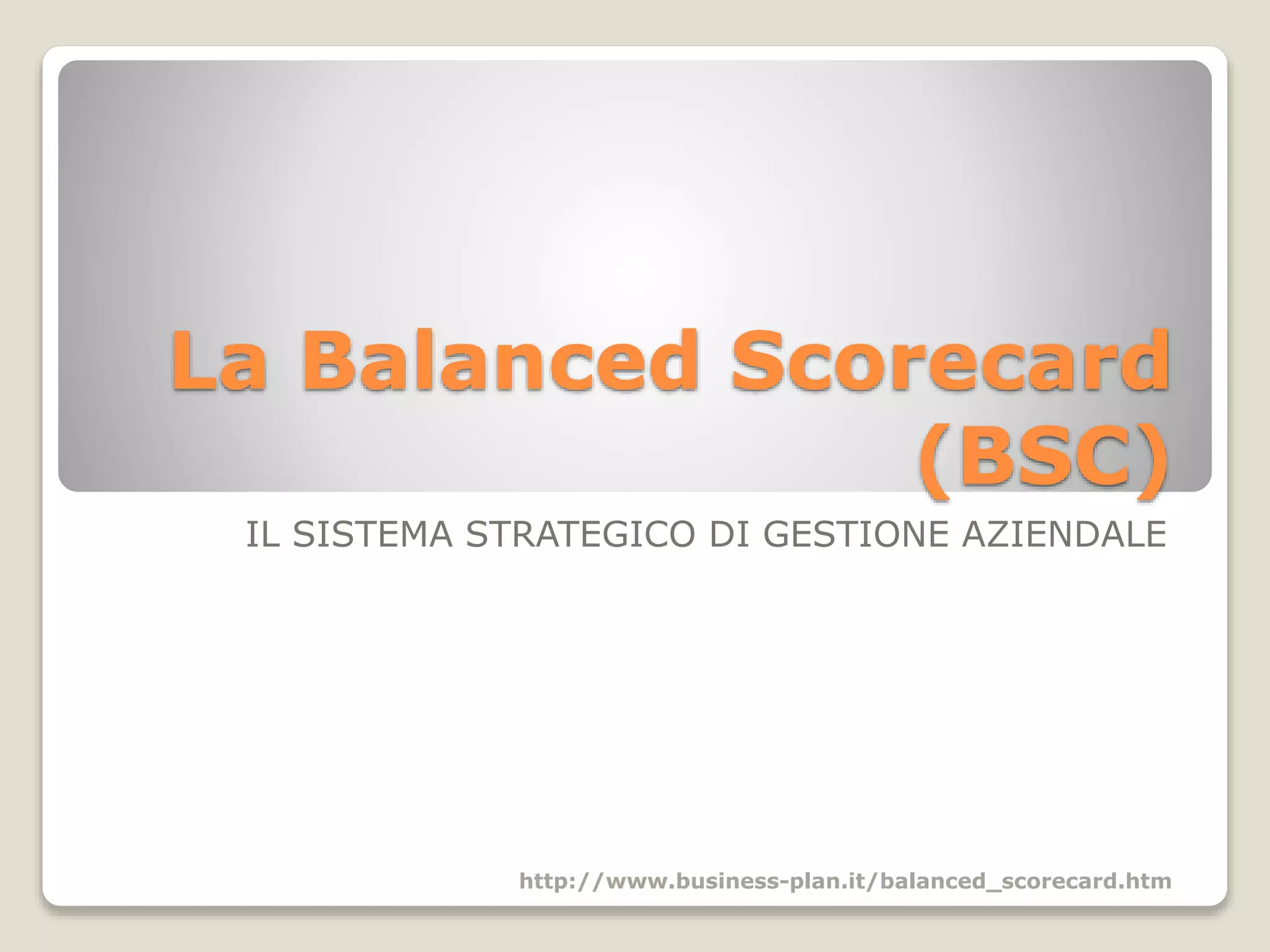 La Balanced Scorecard (BSC) è un sistema strategico di gestione utilizzato da diverse organizzazioni per misurare e gestire le performance aziendali in modo strategico, rispondendo alle esigenze di vari stakeholder. Essa traduce le strategie aziendali in piani operativi attraverso la definizione di obiettivi e l'analisi delle performance in quattro prospettive: finanziaria, cliente, processi interni e apprendimento. Il processo di definizione della strategia si articola in cinque fasi, che includono l'analisi SWOT e l'utilizzo di mappe strategiche per la traduzione delle strategie in obiettivi misurabili.