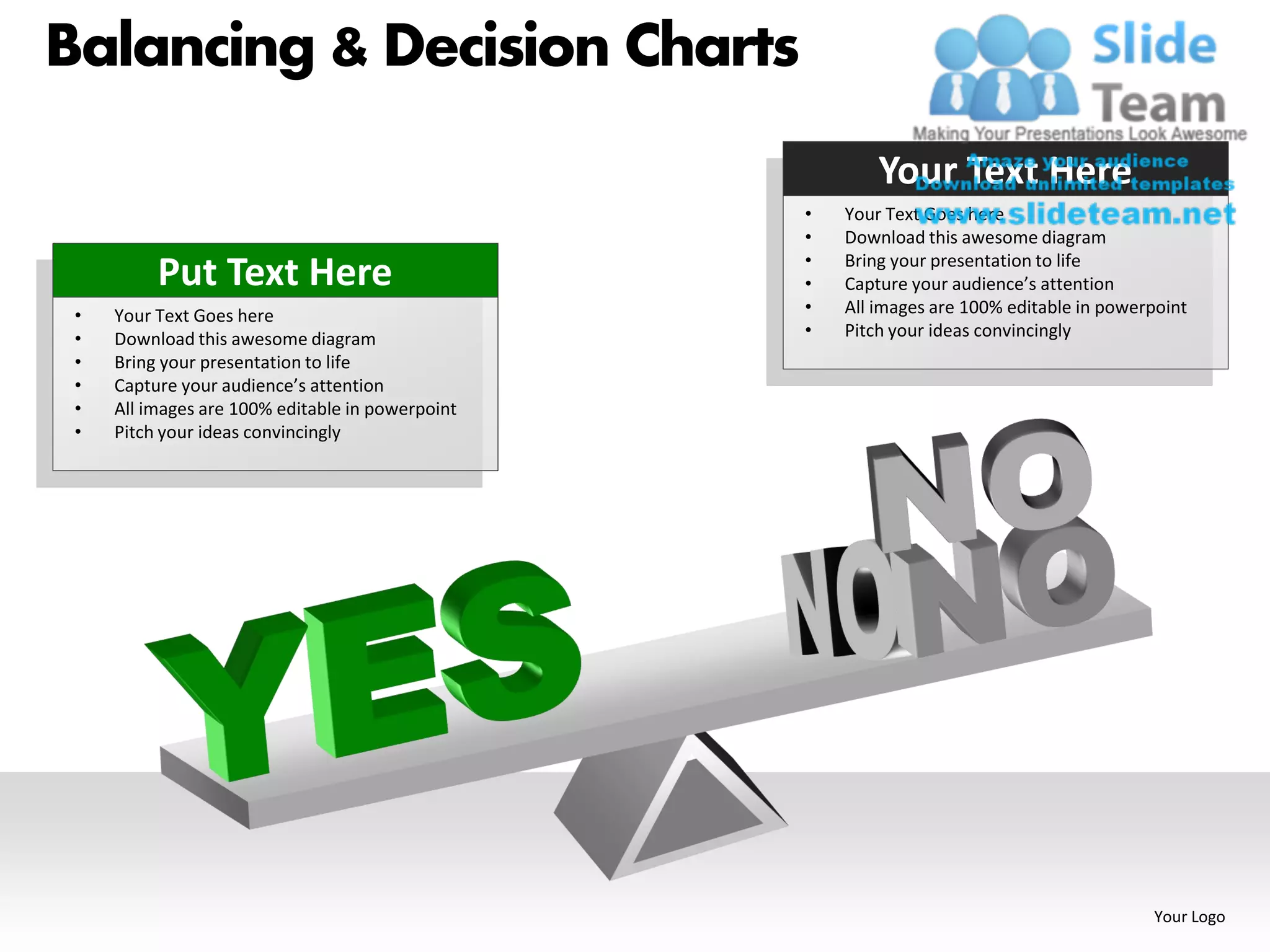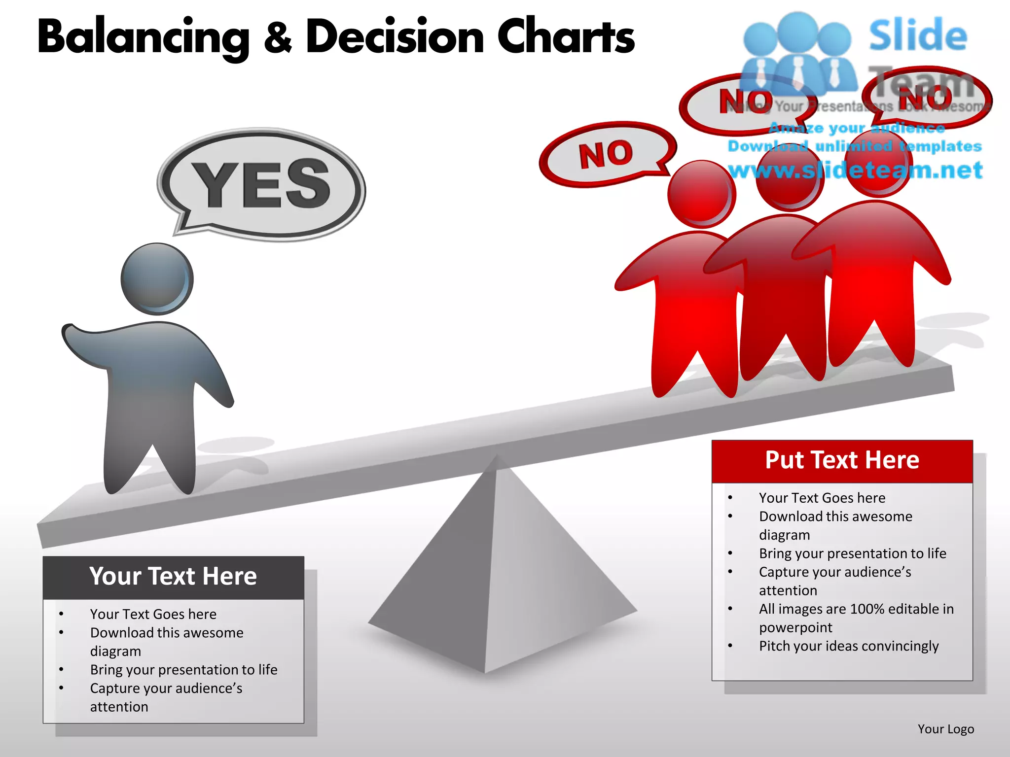 The document discusses balancing and decision charts that can be used in presentations. The charts include templates that can be customized with text blocks for balancing different factors or making decisions. The templates are fully editable and are intended to capture audiences' attention and help pitch ideas convincingly.