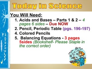This document contains instructions and information for a chemistry class. It lists assignments that are due, including balancing equations and acids and bases work. It also provides definitions for vocabulary words and steps for balancing chemical equations. Balancing equations involves making an inventory of elements and adding coefficients to make the elements equal on both sides of the equation. The document ends by assigning homework to balance 11 equations by Monday and informs students that final exams will start on Tuesday.