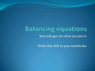 This document provides instructions for balancing chemical equations using the law of conservation of mass. It explains that matter is neither created nor destroyed in chemical reactions, it just changes form. Students are taught to write balanced chemical equations showing the same number and type of atoms on both sides of the reaction. Through an example, it demonstrates how to balance equations by adjusting coefficients in front of compounds to match the number of each element in the reactants and products.