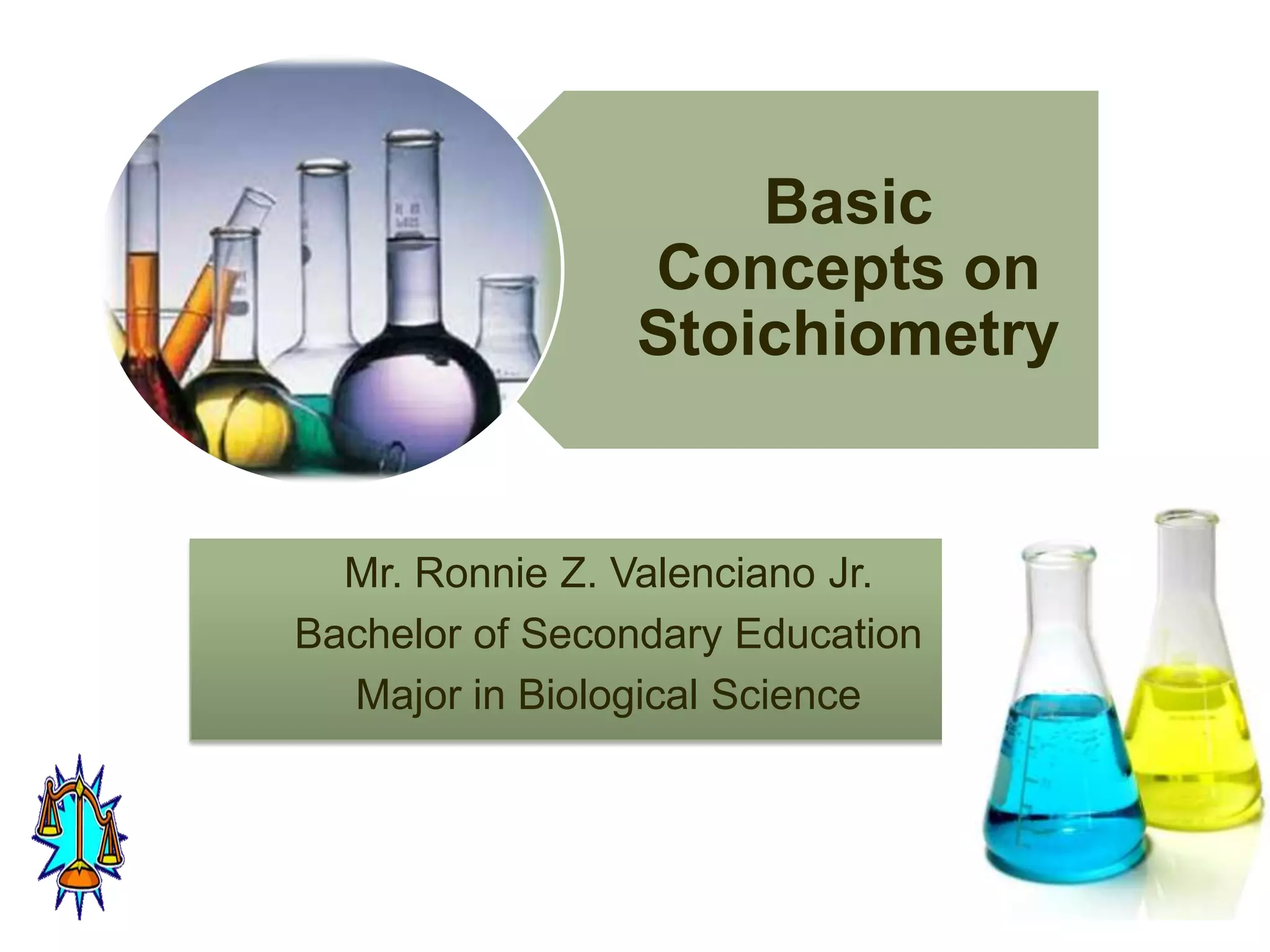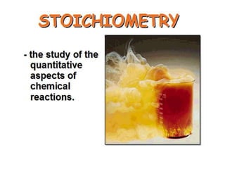 1) The document discusses key concepts in stoichiometry including moles, mole-mass relationships, balancing chemical equations, and using mole ratios to solve stoichiometry problems.