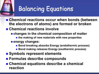 Chemical equations are used to represent chemical reactions. They show the reactants and products, including the types of atoms and molecules involved and their relative quantities. For a chemical equation to be valid, it must be balanced so that the same number of each type of atom is on both sides of the reaction. To balance equations, coefficients are placed in front of formulas as needed to make the number of atoms of each element equal on both sides without changing the subscripts in the formulas. The basic steps to balance equations are to write the correct formulas, identify the atoms on each side, insert coefficients as needed, and check that all elements are balanced.