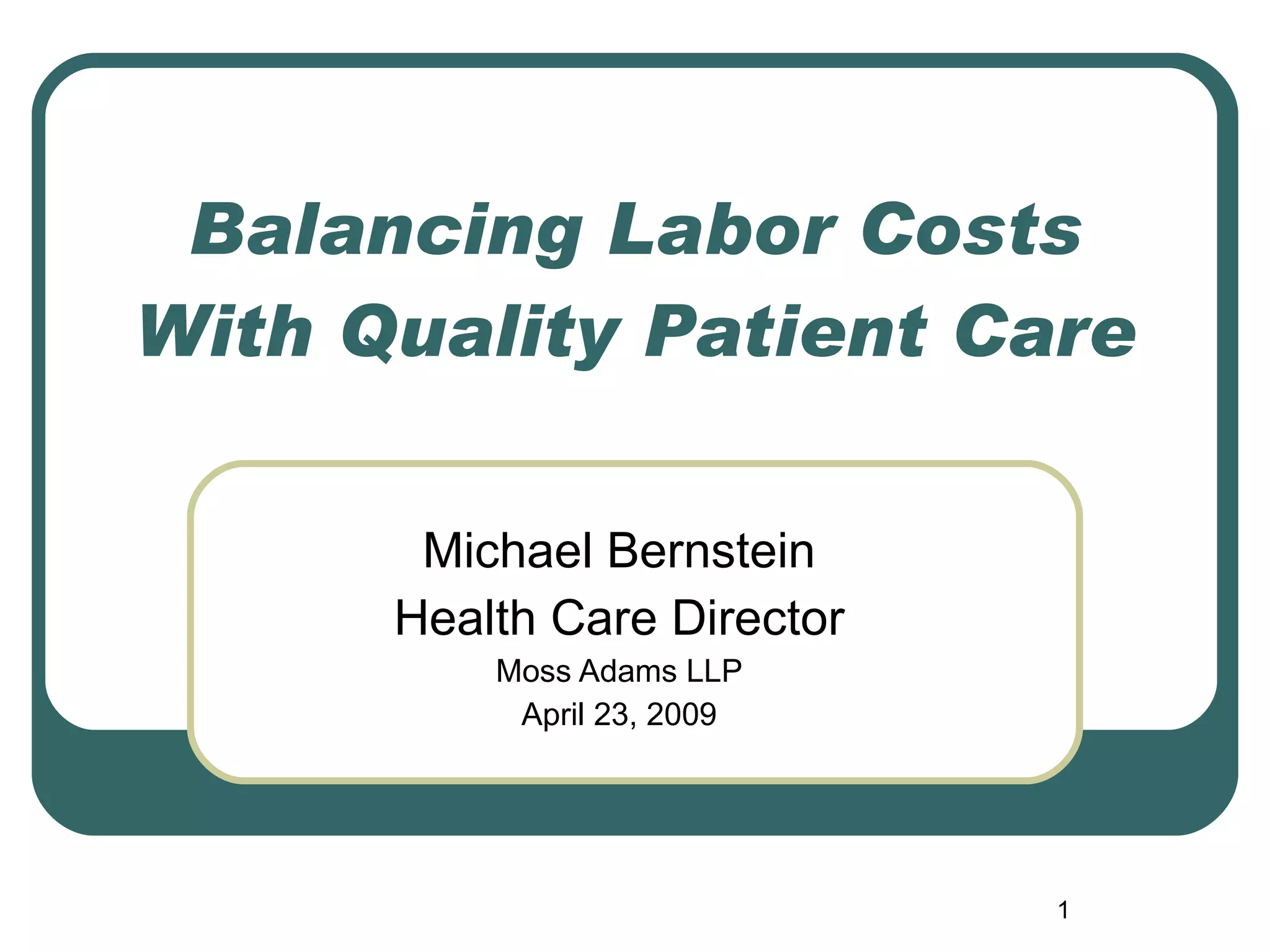 The document discusses balancing labor costs and quality patient care. It describes issues impacting the healthcare industry like reductions in payments and increasing costs. It outlines a workforce management solution using a labor productivity tool to track efficiency, identify variances, and make recommendations. The solution helped a 300-bed hospital reduce premium labor costs by $400,000 in the first year and improve labor productivity by $1.8 million with an ROI of 5 months. Within 2 years it led to reductions in premium labor costs, FTEs, and labor expenses.