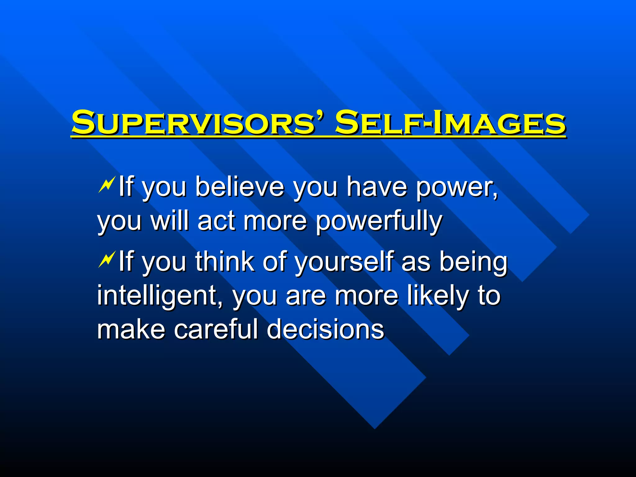 Supervisors should develop self-awareness and focus on their strengths to act confidently and make good decisions. Building respect between supervisors and employees through understanding and support creates a successful organization where employees work harder. Developing a culture of trust, respect, and fairness requires effort but results in improved teamwork, loyalty, performance and productivity. Supervisors should communicate well, fulfill promises, and give credit to develop trust with employees and meet expectations of their own manager through cooperation and keeping them informed.