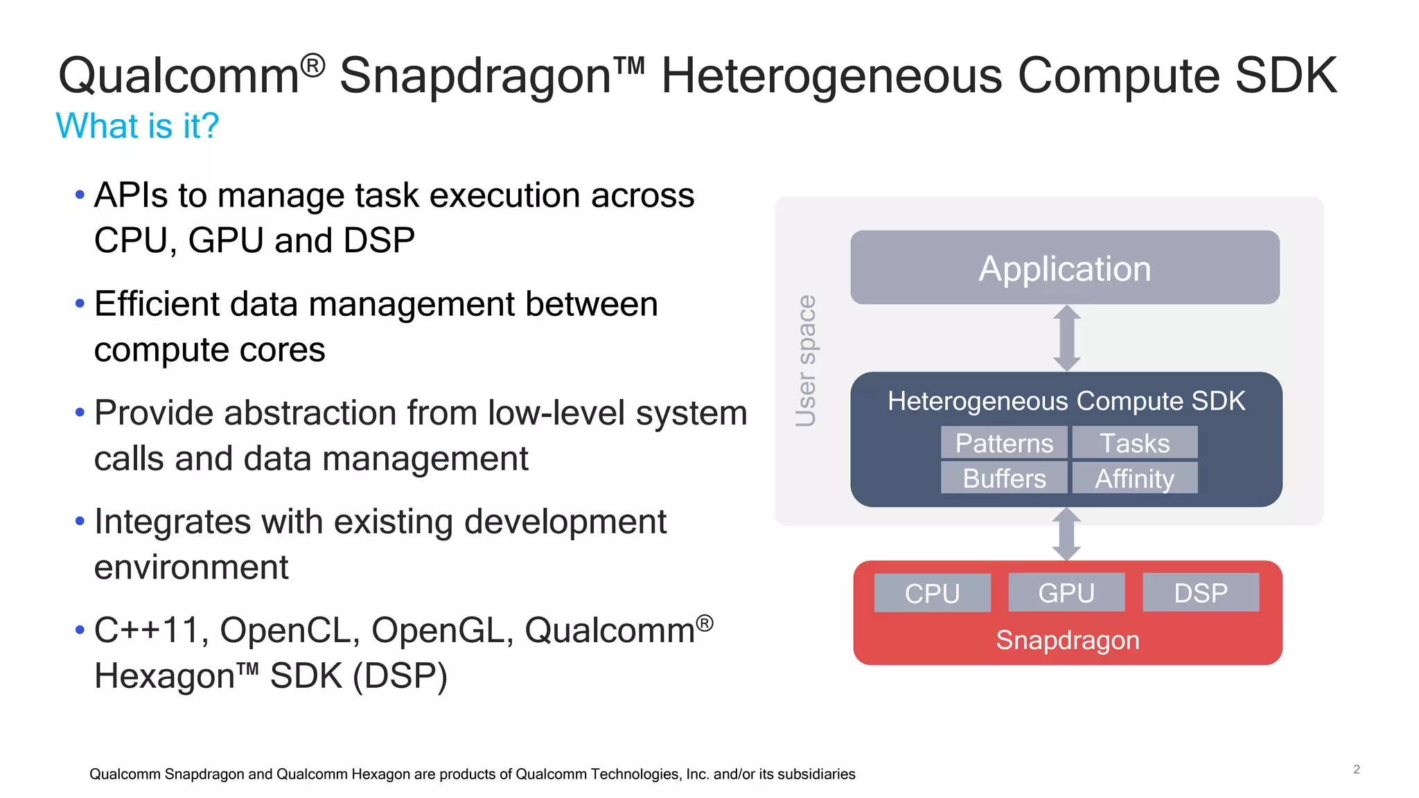 The document discusses Qualcomm's heterogeneous compute SDK for mobile applications that enables efficient task execution across CPU, GPU, and DSP while managing data effectively. It emphasizes patterns for parallel programming, task management, and power optimization techniques through a dedicated SDK, allowing developers to fine-tune performance and energy consumption. Case studies demonstrate how utilizing these tools can significantly improve processing efficiency and reduce power usage.
